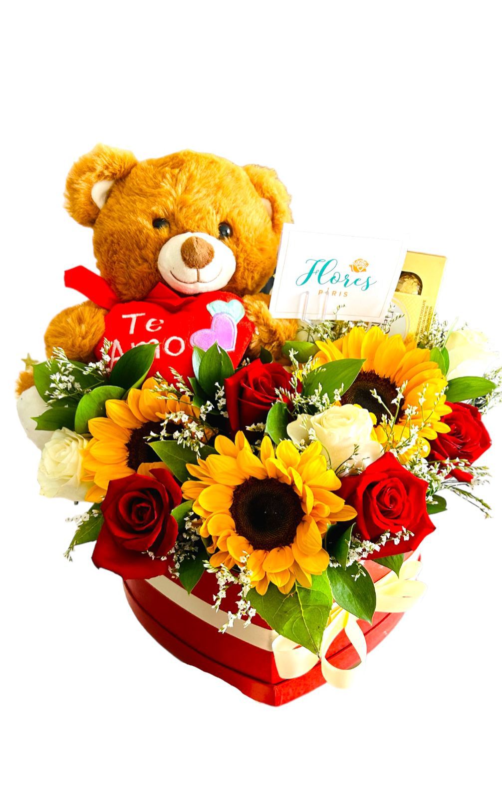 Hermoso arreglo compuesto por mix de rosas y girasoles.