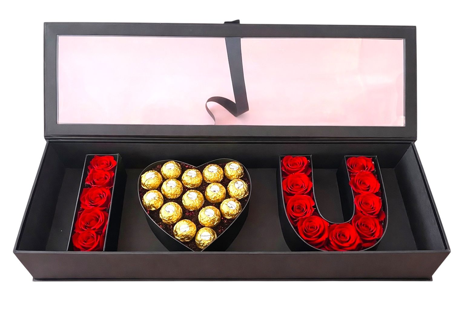 Hermoso box de rosas y chocolates Ferrer rocher en caja premium con mensaje I❤️U