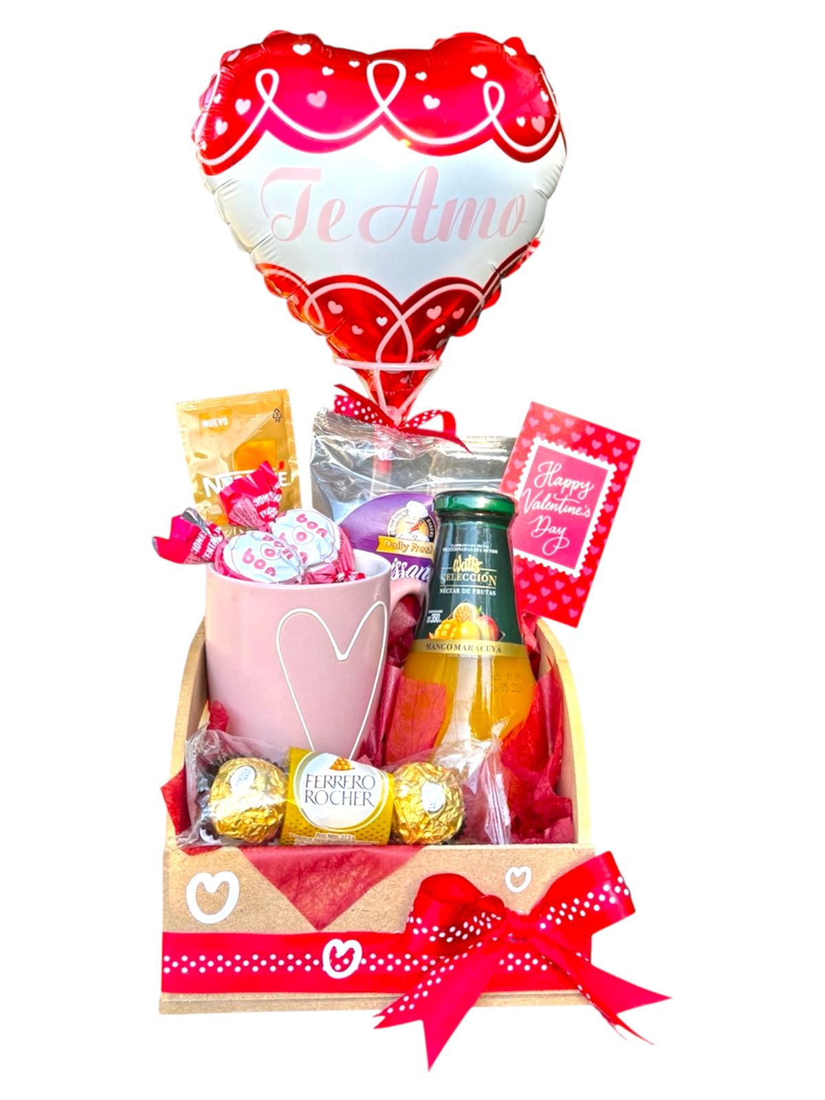 globo corazón, taza decorativa, jugo premium y una deliciosa selección de chocolates y dulces, con tarde de San Valentín.