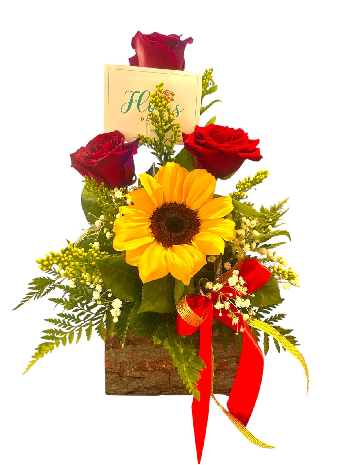 Hermosa combinación de girasol radiante y rosas rojas, acompañadas de finos detalles verdes y delicado lazo decorativo.