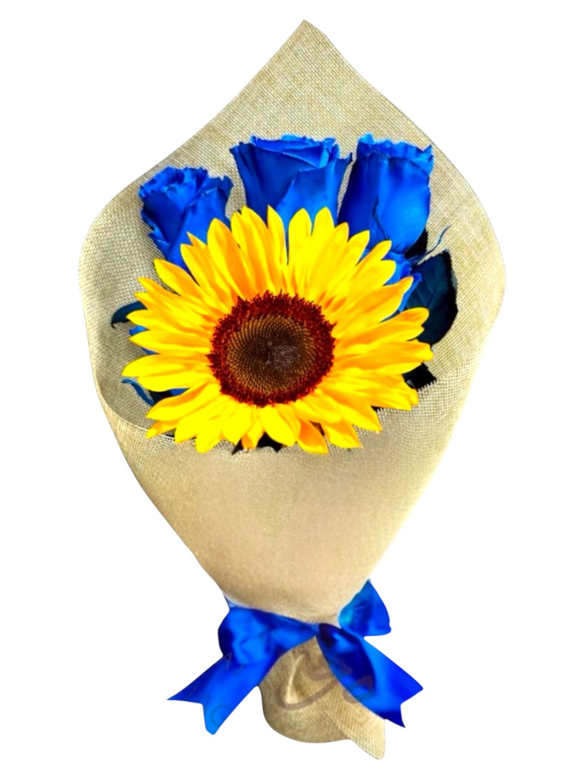Hermoso ramo con rosas azules y un girasol.