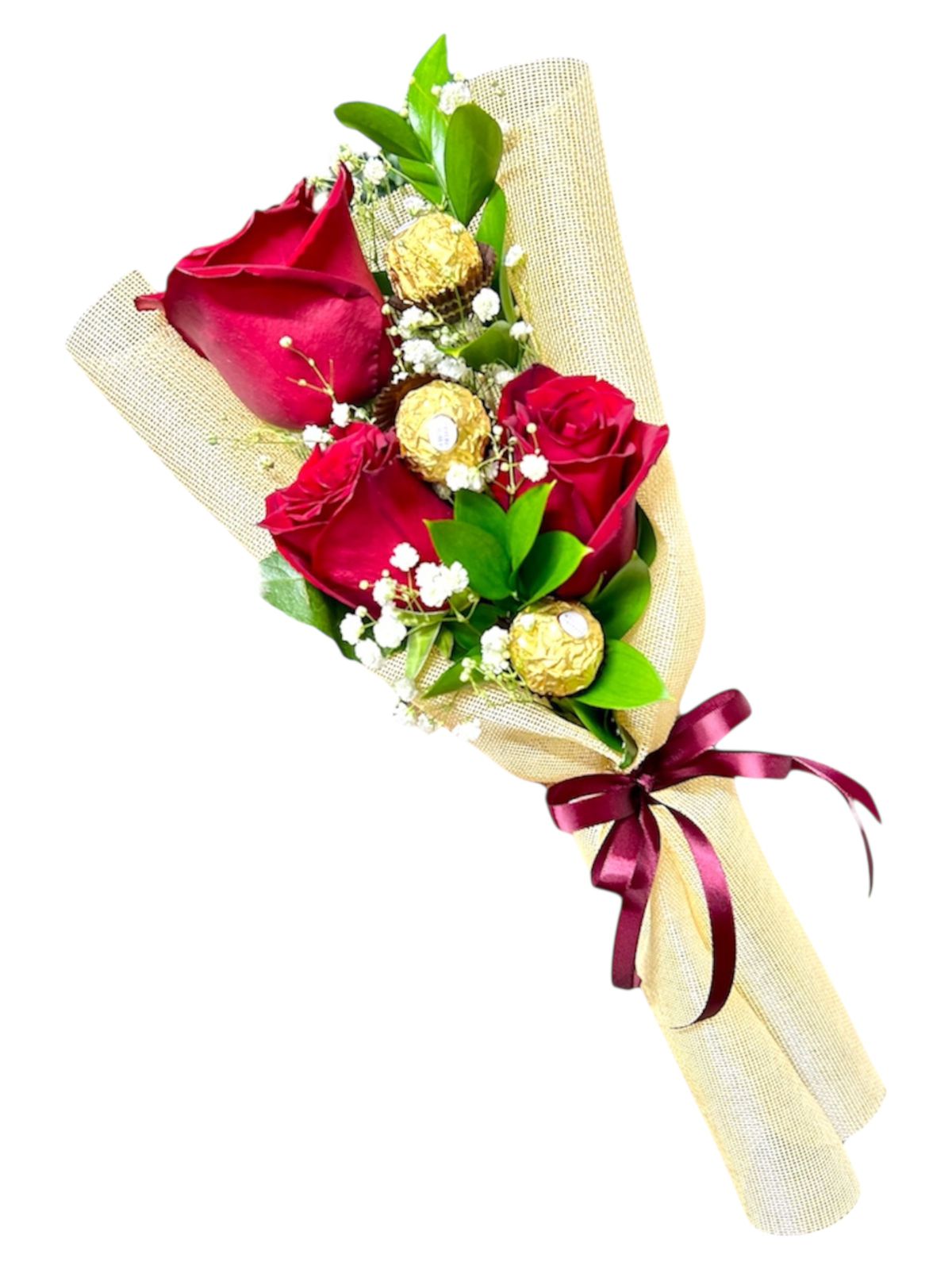 Hermoso ramo de rosas con chocolates ferrer rocher adornado con follaje.