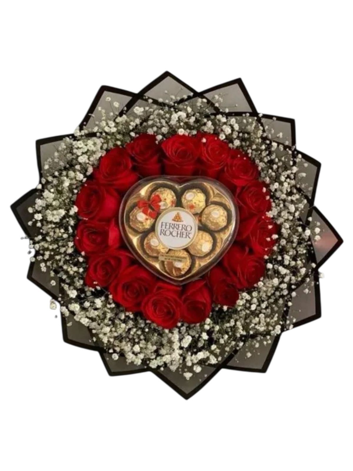 Hermoso y delicado ramo de rosas circular con chocolate ferrer rocher.