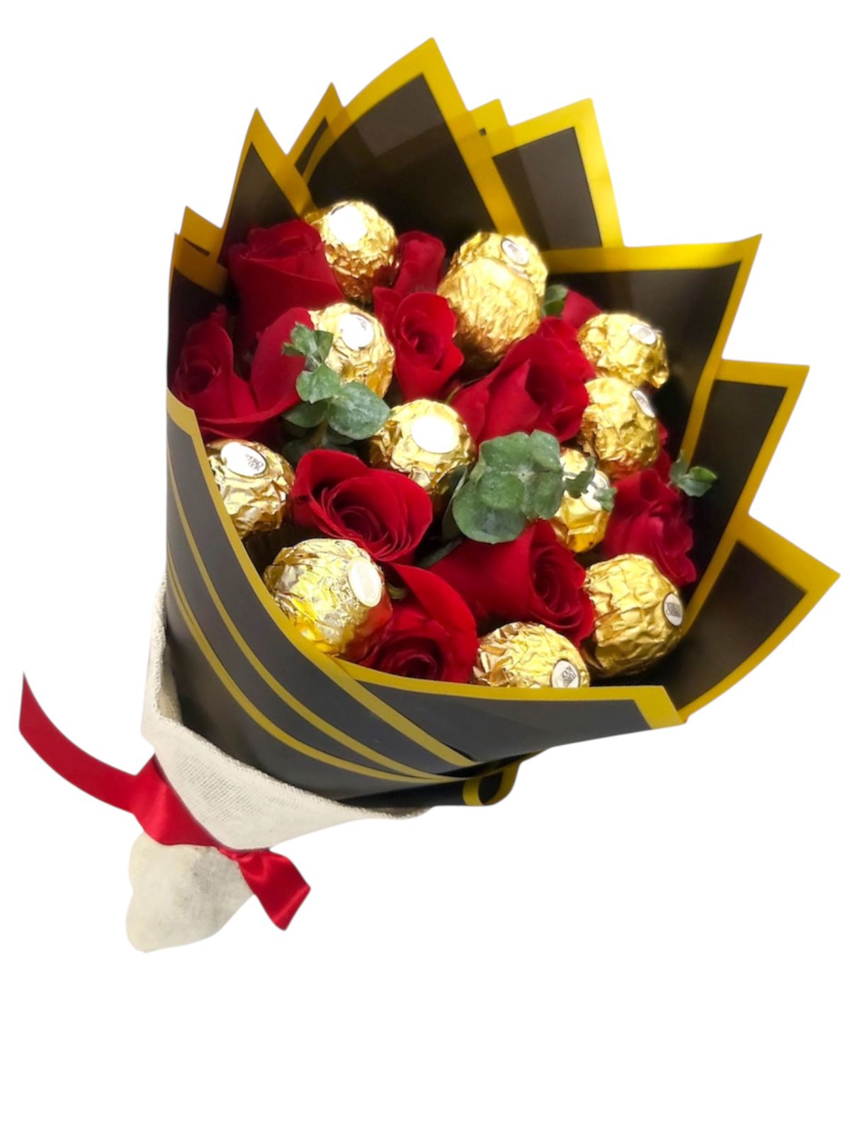 Hermoso ramo de rosas con chocolate ferrer rocher.
